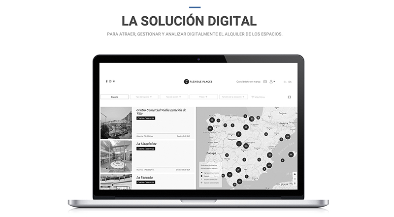 Buscar la máxima rentabilidad de los espacios dedicados a los alquileres, es cada día más determinante para todos los activos inmobiliarios y www.flexibleplaces.com/espacio es un buscador digital que permite visualizar todos los espacios comerciales y además analizar toda la gestión global del alquiler; desde la petición de reserva por parte de la marca, hasta la firma del contrato, incorporando también todo el proceso de facturación y gestión.