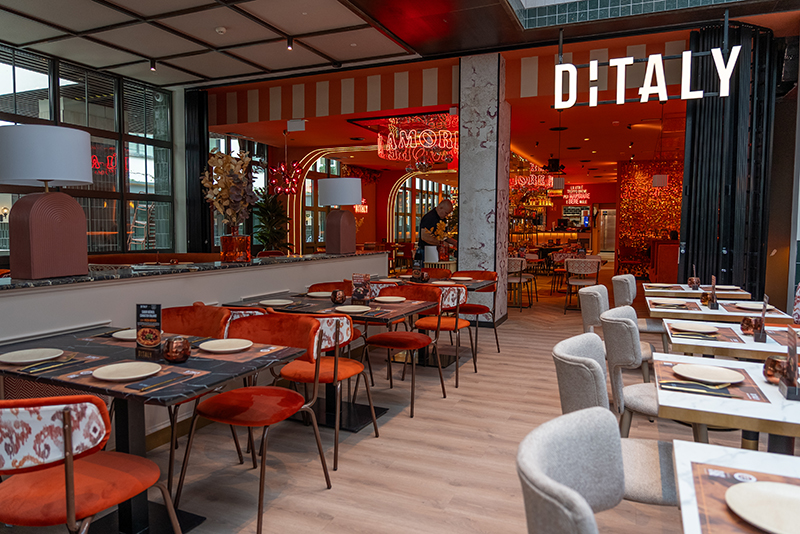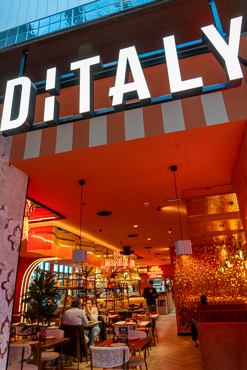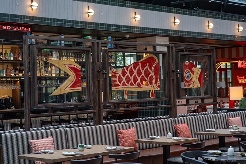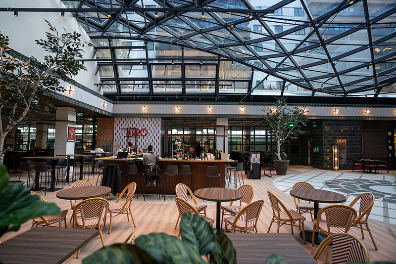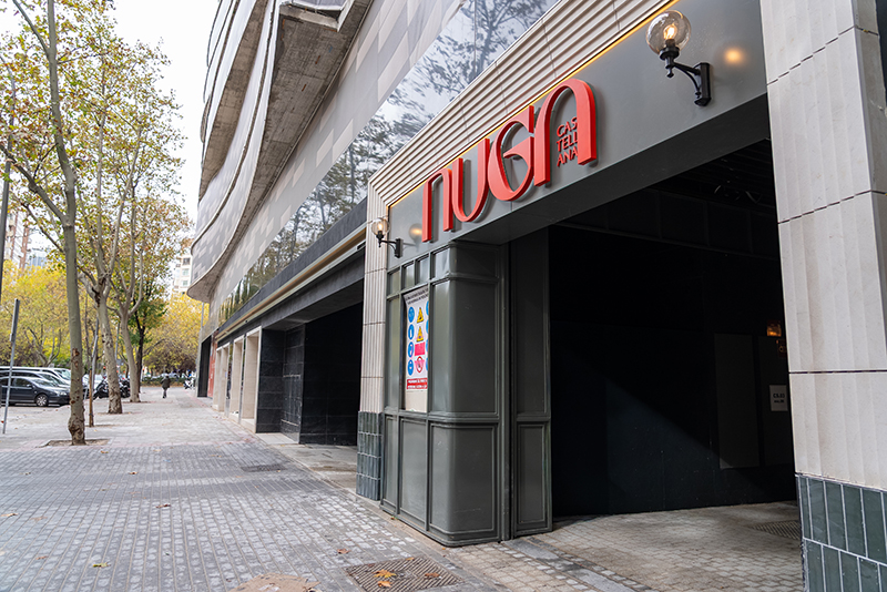 La oferta de restauración se articula en torno a El Callejón de Nuga, un espacio que actúa como nexo entre los distintos usos del complejo. Incluye una plaza interior con un gran lucernario y un área exterior con terrazas y servicios de bienestar. Una de sus principales singularidades es su apertura a las cuatro calles que rodean la manzana, generando un flujo natural de acceso desde el entorno.