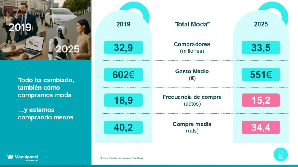 El gasto anual en moda en España ha caído desde 2019 un 8,5 % hasta los 551 euros, con casi 4 actos menos de compra (hasta las 15,2 ocasiones actuales) y 6 prendas menos (hasta las 34 actuales), según el informe Moda y sostenibilidad de Worldpanel by Numerator.