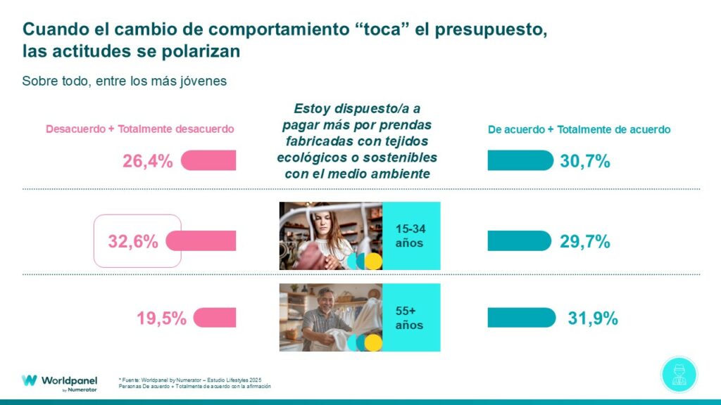 No obstante, entre la opinión y el compromiso efectivo hay todavía una brecha que se refleja en que solo un 30,7 % de los españoles está dispuesto a pagar más por prendas fabricadas con tejidos ecológicos o sostenibles.