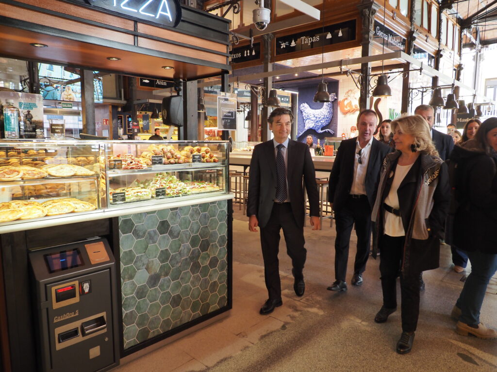 El Mercado de San Miguel ha reabierto oficialmente tras el corte de cinta institucional con la presencia de (en la imagen superior, de izquierda a derecha) Carlos Segura, concejal presidente del distrito Centro del Ayuntamiento de Madrid, Engracia Hidalgo, delegada del Área de Gobierno de Economía, Innovación y Hacienda, e Israel Casanova, director general de Redevco en España y Portugal.