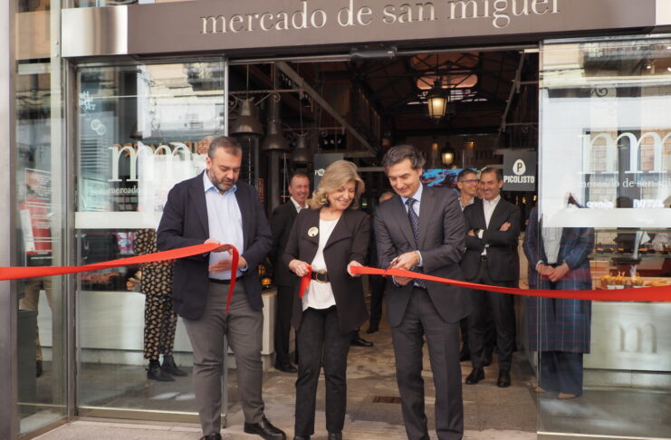 El Mercado de San Miguel ha reabierto oficialmente tras el corte de cinta institucional con la presencia de (en la imagen superior, de izquierda a derecha) Carlos Segura, concejal presidente del distrito Centro del Ayuntamiento de Madrid, Engracia Hidalgo, delegada del Área de Gobierno de Economía, Innovación y Hacienda, e Israel Casanova, director general de Redevco en España y Portugal.