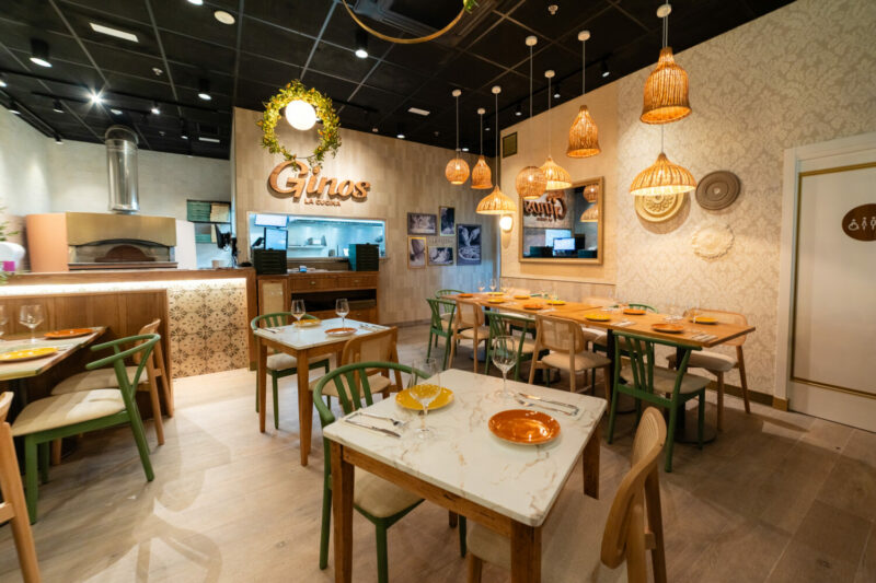 El nuevo restaurante luce la nueva imagen de estilo mediterráneo y decoración de Ginos, con una superficie que supera los 90 metros cuadrados y aforo para más de 85 comensales. Además, cuenta con un total de 20 trabajadores: 12 en sala y 8 en cocina. Este nuevo establecimiento cuenta con un horno de piedra visto para que los clientes puedan apreciar en persona cómo se amasan y hornean sus pizzas, con masa fina o napoletana y al mejor estilo italiano.