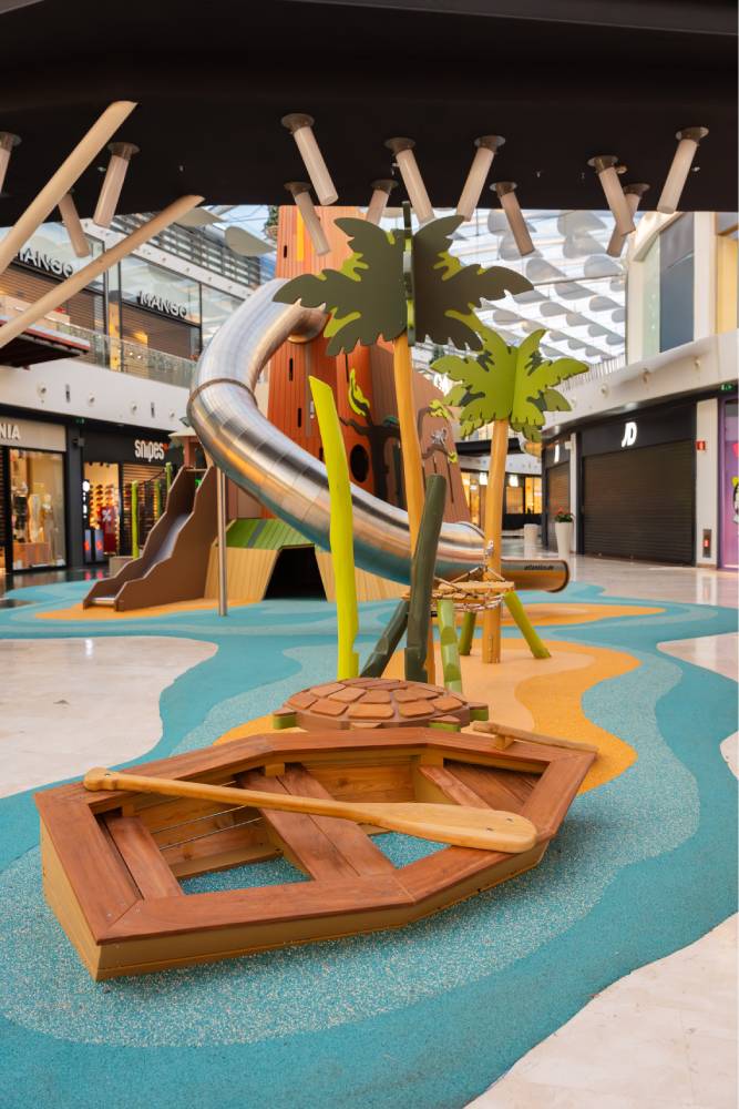El recorrido del playground invita a sumergirse en un universo tropical: los pequeños podrán trepar por estructuras inspiradas en grandes palmeras, refugiarse en acogedoras cabañas, sumergirse en el interior de un volcán misterioso, descender por un emocionante tobogán tubular o subirse al impresionante tiburón ballena que preside la isla. Cada rincón incita a dejar volar la imaginación, explorar sin límites y disfrutar de momentos en familia.