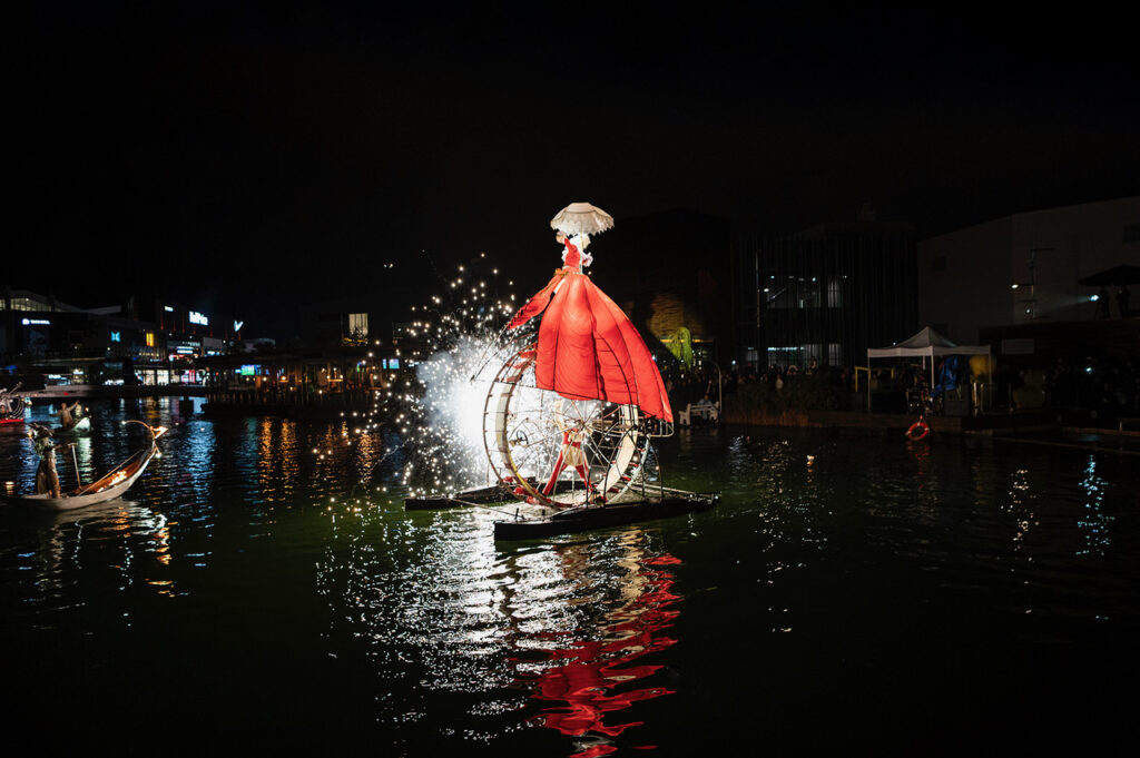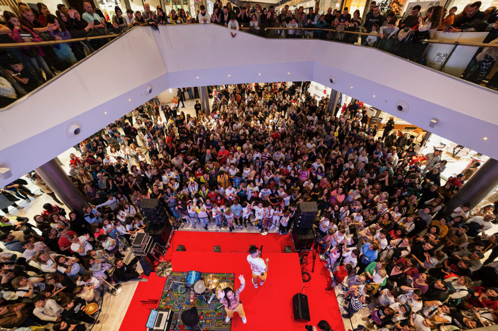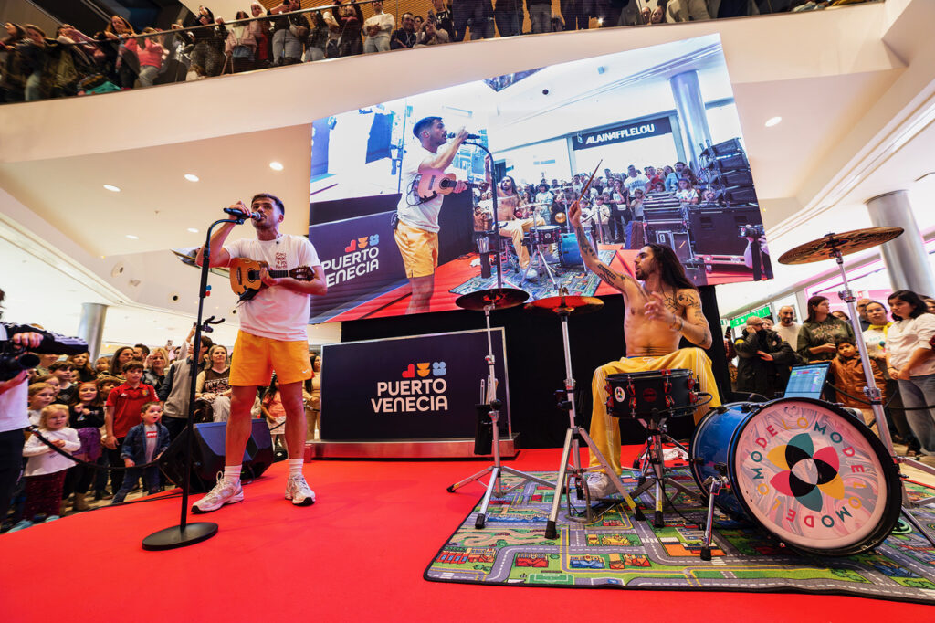 El público asistió al show internacional Aqua Forte Parade, de la compañía Ilotopie, que combinó acrobacias aéreas, coreografías acuáticas y un gran despliegue visual y pirotécnico en una puesta en escena desarrollada en el lago del espacio comercial. La noche culminó con la actuación especial del grupo aragonés Modelo, que interpretó en la galería comercial en directo su nueva canción “Ese algo que tienes”, que adoptará Puerto Venecia en esta nueva etapa, y que sonará como nota instrumental y jingle del complejo comercial.