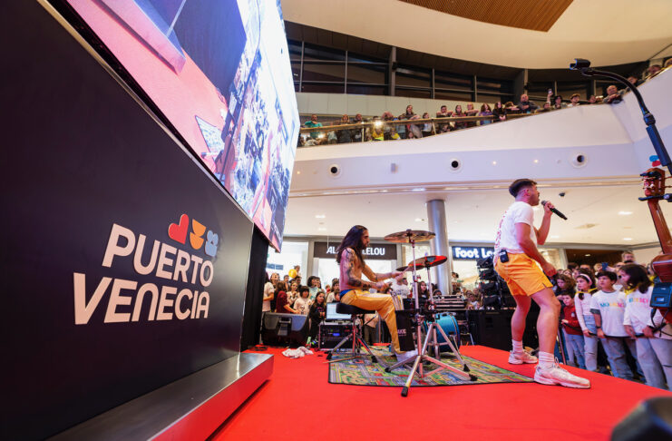 El público asistió al show internacional Aqua Forte Parade, de la compañía Ilotopie, que combinó acrobacias aéreas, coreografías acuáticas y un gran despliegue visual y pirotécnico en una puesta en escena desarrollada en el lago del espacio comercial. La noche culminó con la actuación especial del grupo aragonés Modelo, que interpretó en la galería comercial en directo su nueva canción “Ese algo que tienes”, que adoptará Puerto Venecia en esta nueva etapa, y que sonará como nota instrumental y jingle del complejo comercial.